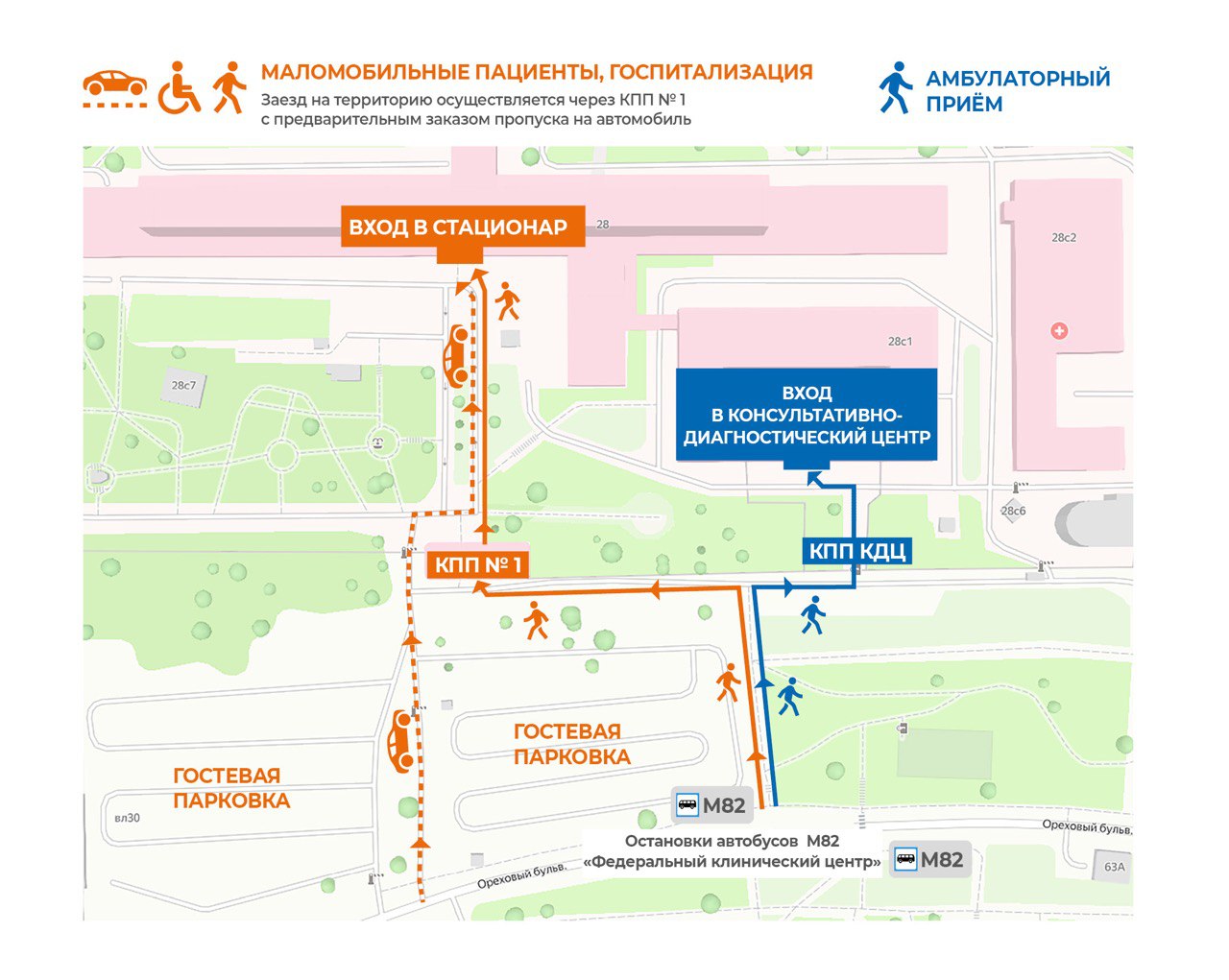 Обращаем внимание, что при въезде на территорию, автомобиль будет визуально осмотрен в целях обеспечения антитеррористической безопасности, предотвращения ввоза запрещённых предметов, веществ и материалов, а также соблюдения правил внутреннего распорядка на территории ФНКЦ ФМБА России.